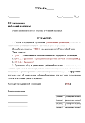 Приказ «Об уничтожении требований-накладных» вместе с Актом об уничтожении требований-накладных и Инструкцией «Правила хранения и уничтожения требований-накладных» для больничной аптеки 500 руб