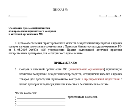 Приказ о создании приемной комиссии для проведения приемочного контроля в аптеке медицинской организации 300 руб