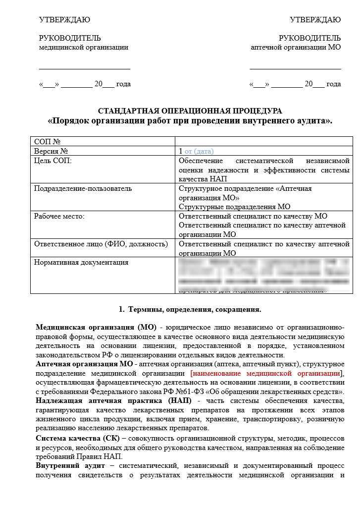 Мы предлагаем готовое решение — подробную Стандартную операционную процедуру (СОП), которая полностью регламентирует порядок организации и проведения внутренних аудитов в больничной аптеке. Этот стандарт разработан в строгом соответствии с актуальными требованиями законодательства и содержит все необходимые шаги и шаблоны для немедленного внедрения.
