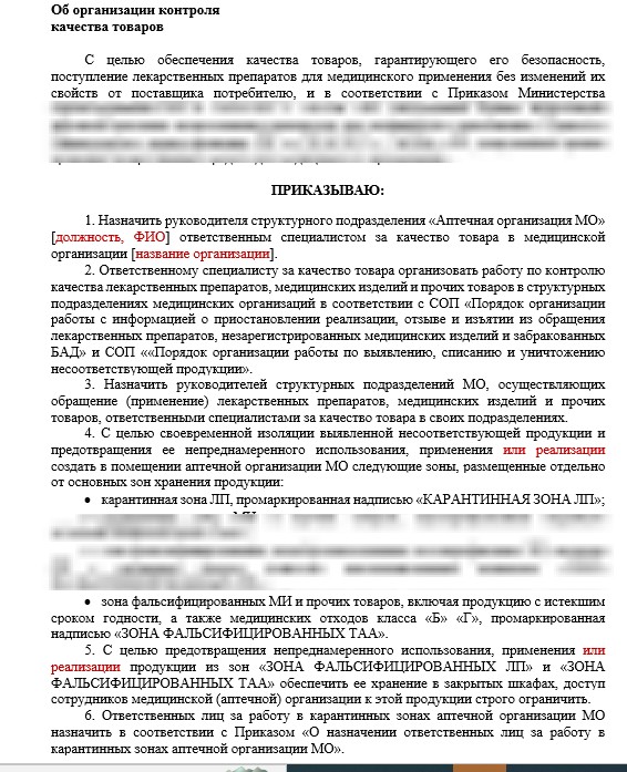 В условиях медицинской организации (МО) ответственность за качество лекарств не заканчивается на пороге аптеки. Она распространяется на все отделения, где применяются препараты. Чтобы выстроить легитимную систему надзора, необходим основополагающий распорядительный акт. Предлагаемый Приказ «Об организации контроля качества в больничной аптеке» — это готовый юридический инструмент, который распределяет зоны ответственности между заведующим аптекой и персоналом клинических отделений.