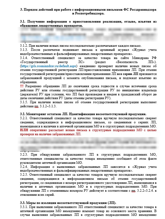 Главная особенность данного СОПа — интеграция клинических отделений в процесс контроля. Документ четко прописывает: если брак обнаружен у старшей медсестры, она обязана немедленно вернуть его в аптеку для изоляции. Это снимает ответственность с аптеки за "забытые" в отделениях упаковки.
