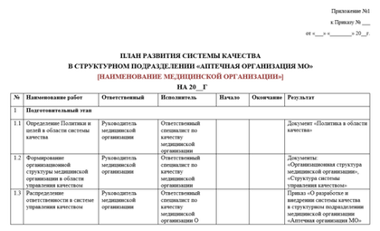 Для работы по организации контроля качества товаров Руководитель медицинской организации Приказом «Об организации контроля качества товара» назначает ответственного специалиста за качество товаров в структурном подразделении «Аптечная организация МО», ответственных специалистов за качество товара в структурных подразделениях медицинской организации.