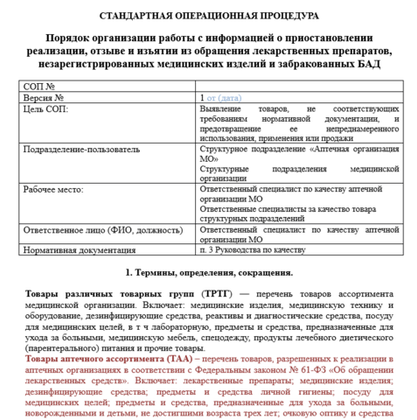- СОП «Порядок организации работы с информацией о приостановлении реализации, отзыве и изъятии из обращения лекарственных препаратов, незарегистрированных медицинских изделий и забракованных БАД»;