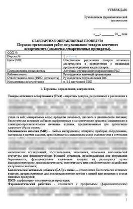 Документ входит в состав документации системы качества для аптечных организаций Надлежащая аптечная практика (НАП), наличие которой установлено Приказом министерства здравоохранения РФ от 29.04.2025 г. № 259н "Об утверждении правил надлежащей аптечной практики лекарственных препаратов для медицинского применения".